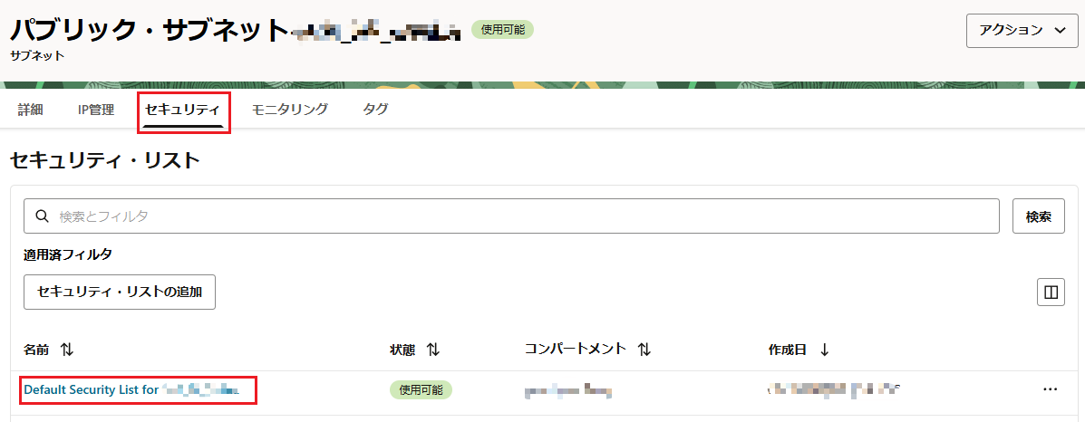 サブネットの詳細画面で、「セキュリティ」タブをクリックし、セキュリティリストをクリックします。