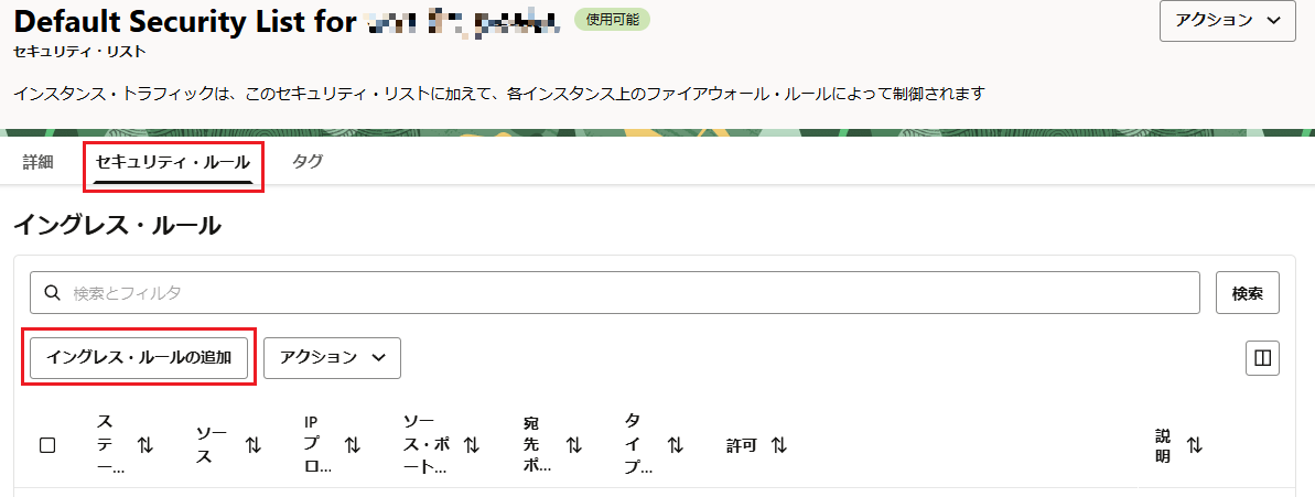 セキュリティリストの詳細画面で、「セキュリティ・ルール」をクリックし、「イングレス・ルールの追加」をクリックします。