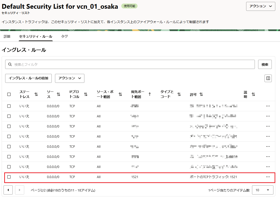 Autonomous Database の TLS 接続は、デフォルトで 1521 ポートを使用します。ポート1521のトラフィックを許可するには、サブネットに対してイングレス・ルールを追加する必要があります。