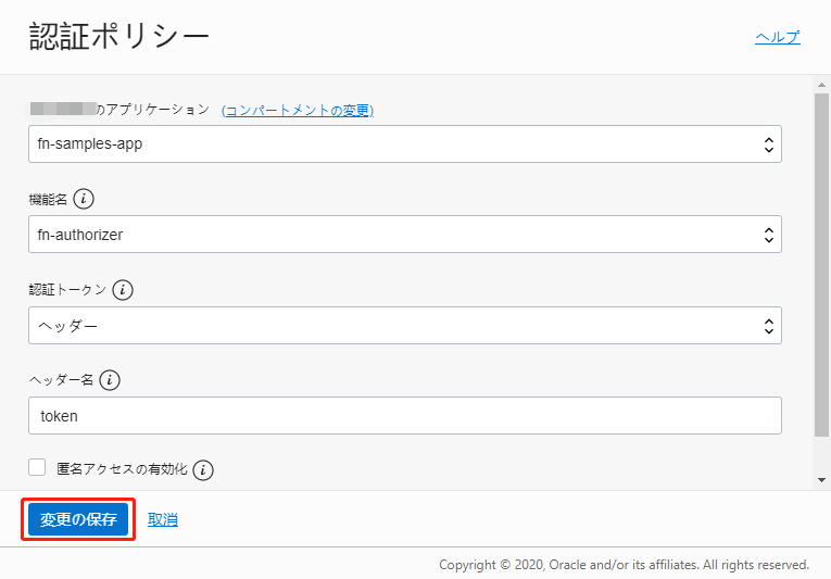 - サブネット:Functionを実行するサブネット。今回は、Oracle Functionsハンズオンで作成したVCNのサブネットを指定。