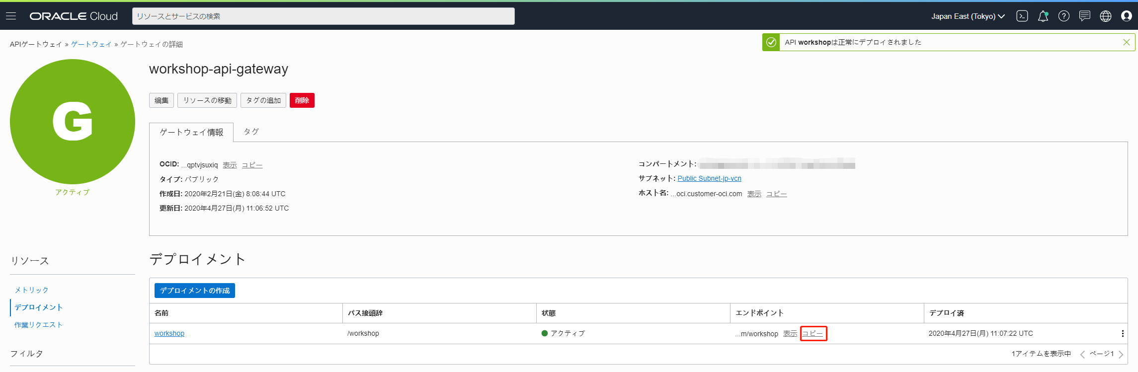 APIデプロイメントのリストで、作成したばかりの新しいAPIデプロイメントのエンドポイントの横にある[コピー]をクリックして、エンドポイントをコピーします。