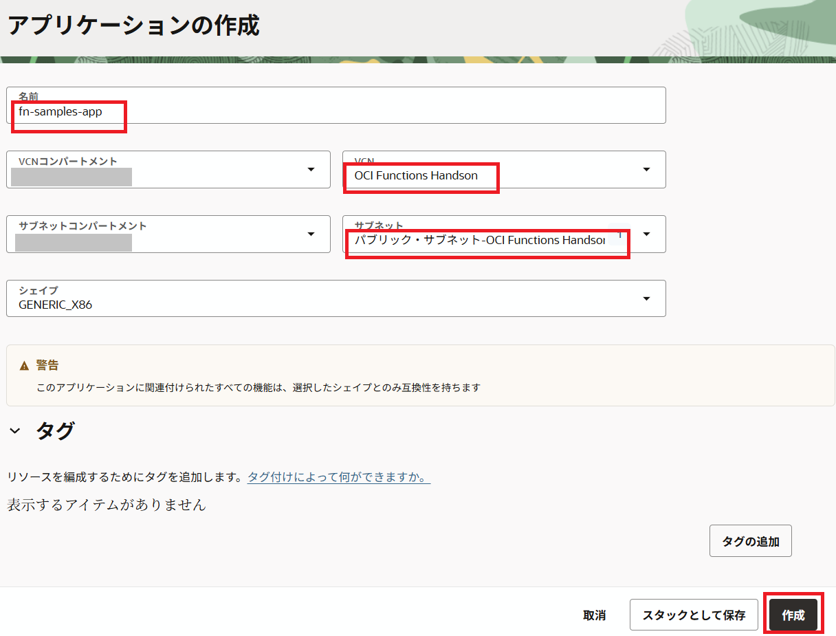 • VCN:Functionを実行するVCN。今回は、Oracle Functionsハンズオンで作成したVCNを指定。