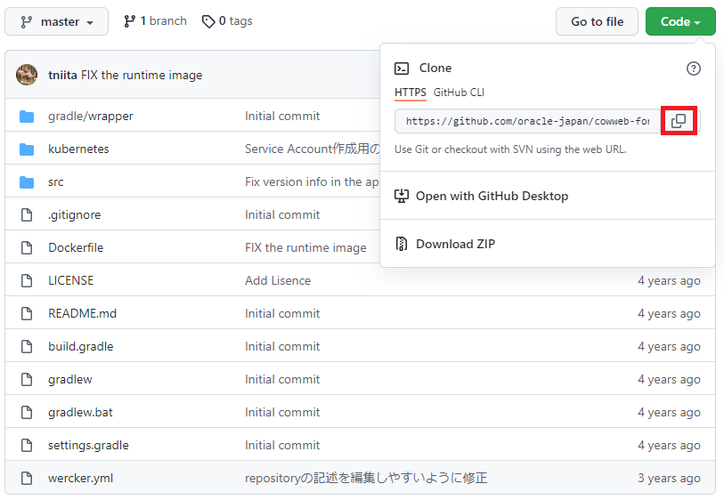 サンプルアプリケーションのリポジトリにアクセスして、Codeボタンをクリックします。