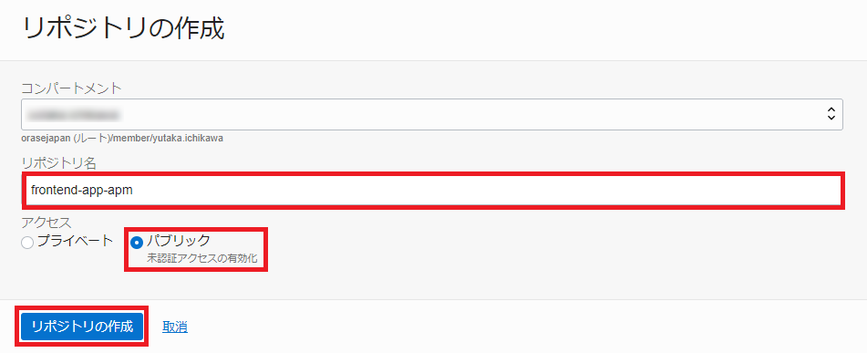 レポジトリ名についてOCIRのレポジトリ名はテナンシで一意になります。 集合ハンズオンなど複数人で同一環境を共有されている皆様は、frontend-app-apm01やfrontend-app-apm-tnなどの名前のイニシャルを付与し、名前が重複しないようにしてください。