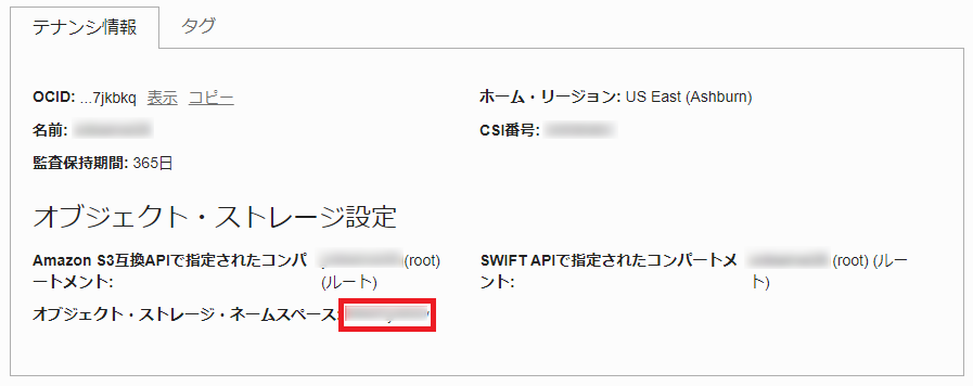 次に、<オブジェクト・ストレージ・ネームスペース>を確認します。