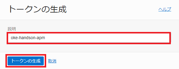 「説明」に「oke-handson-apm」と入力して、「トークンの生成」ボタンをクリックします。