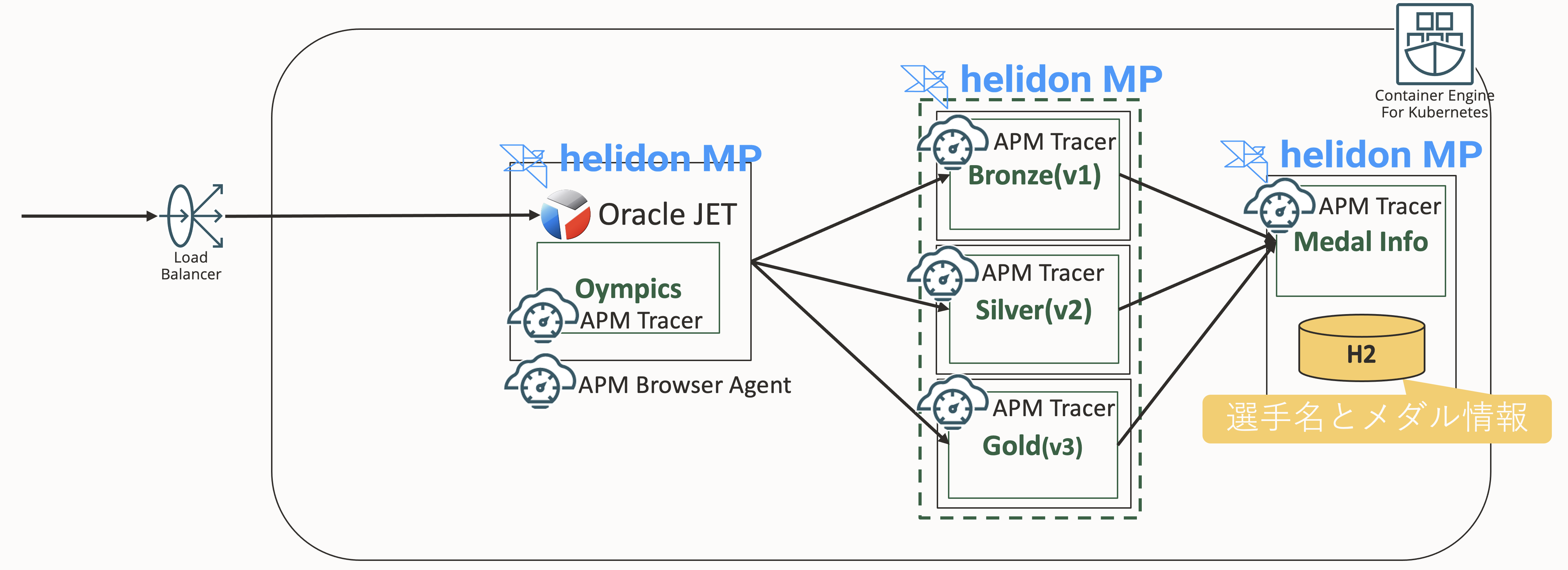 アプリケーション側(Helidon)では、APM Server Agentがこの環境変数を読み込み、APMに対してトレース情報やメトリクスのアップロードを行なっています。