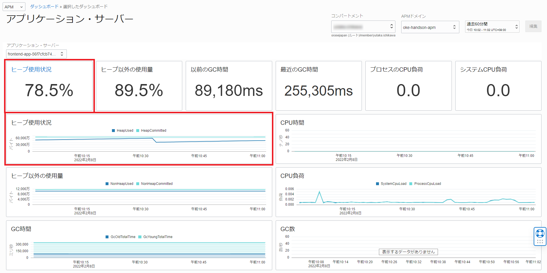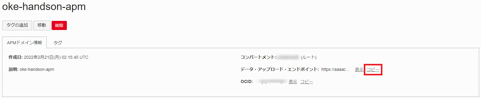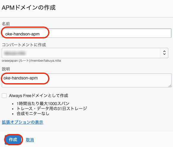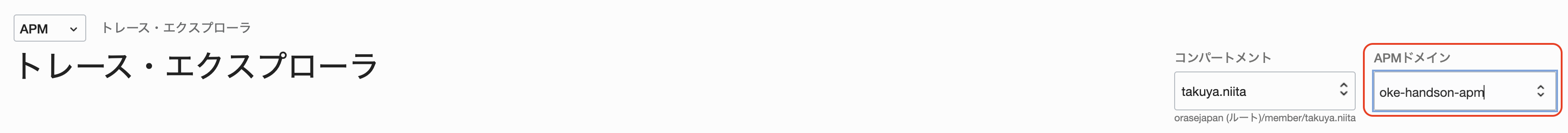 APMドメインのプルダウンメニューから「oke-handson-apm」を選択します。