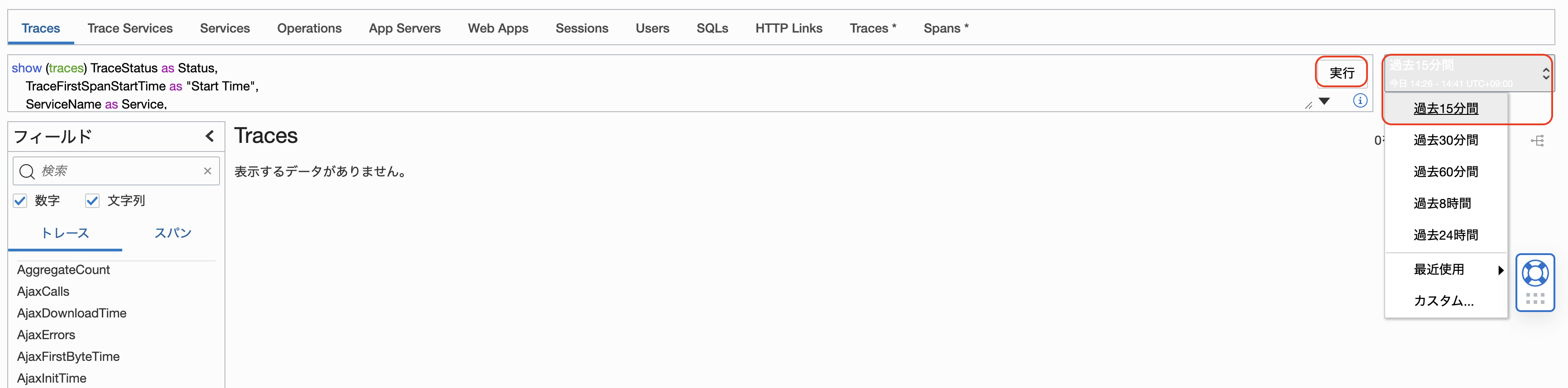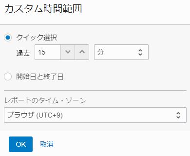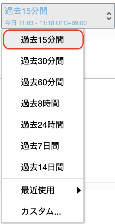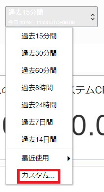右上にあるプルダウンメニューから過去の時間で確認できます。「カスタム」を選択すると、任意の時間を設定できます。