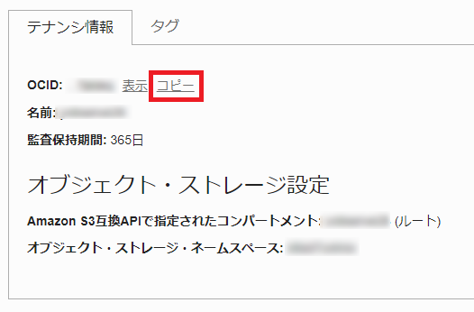 「テナンシ詳細」の「オブジェクト・ストレージ・ネームスペース」の赤枠箇所をコピーして、テキストエディタにペーストしておきます。