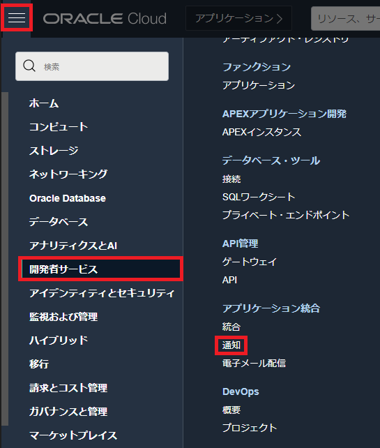 左上のハンバーガーメニューを展開して、「開発者サービス」から「Kubernetesクラスタ(OKE)」を選択します。