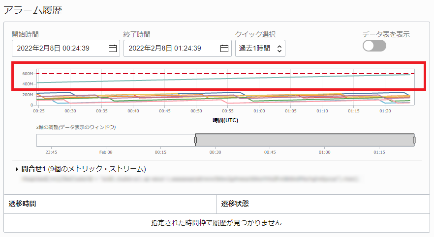 赤い破線が設定した閾値となります。この閾値を超えるとアラームが上がって、メールで通知されます。