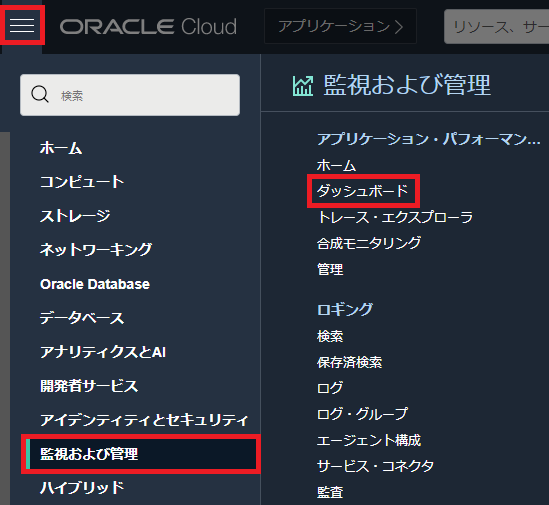 左上のハンバーガーメニューをクリックして、「監視および管理」-「ダッシュボード」を選択します。
