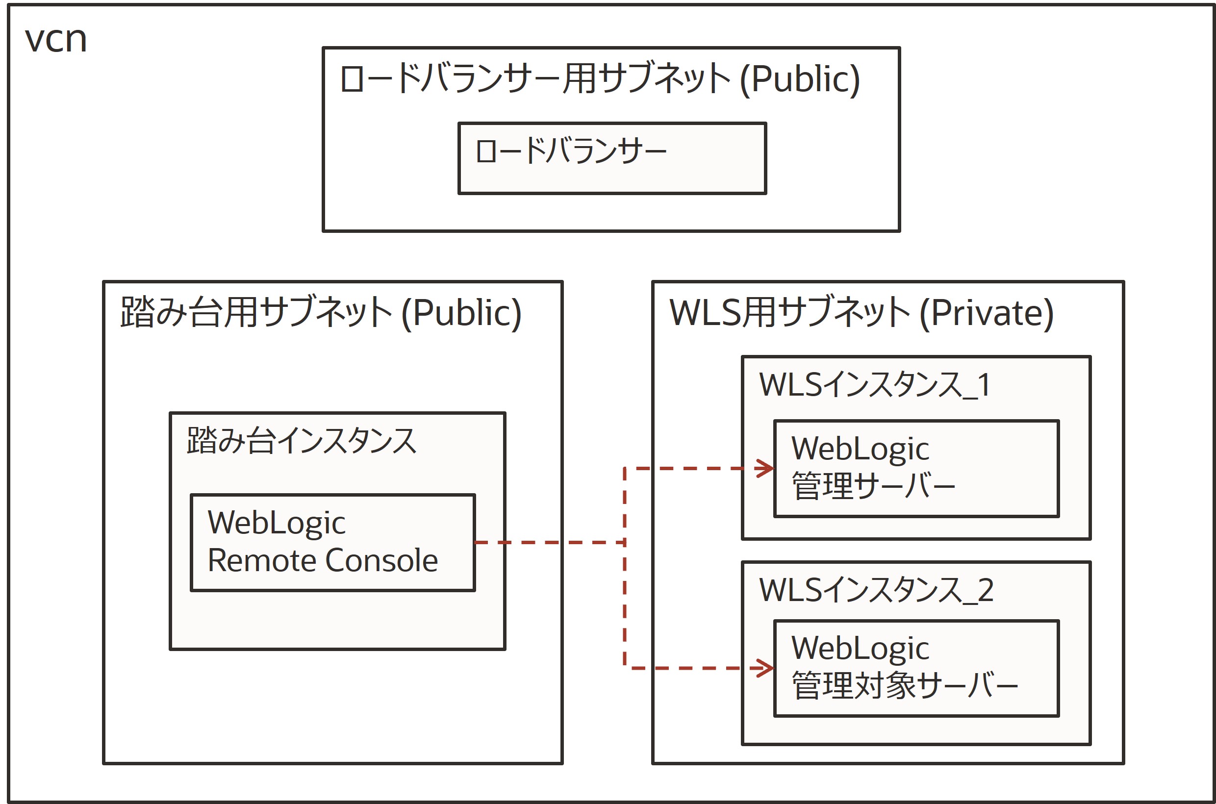マーケットプレイスから環境を作成すると、VCN(仮想クラウド・ネットワーク)やロードバランサーが自動的に構成され、プライベートネットワーク上にWebLogicがインストールされたインスタンスが作成されます。また、外部からのアクセス用に踏み台サーバー(Bastion)とパブリックサブネットも自動的に作成されます。