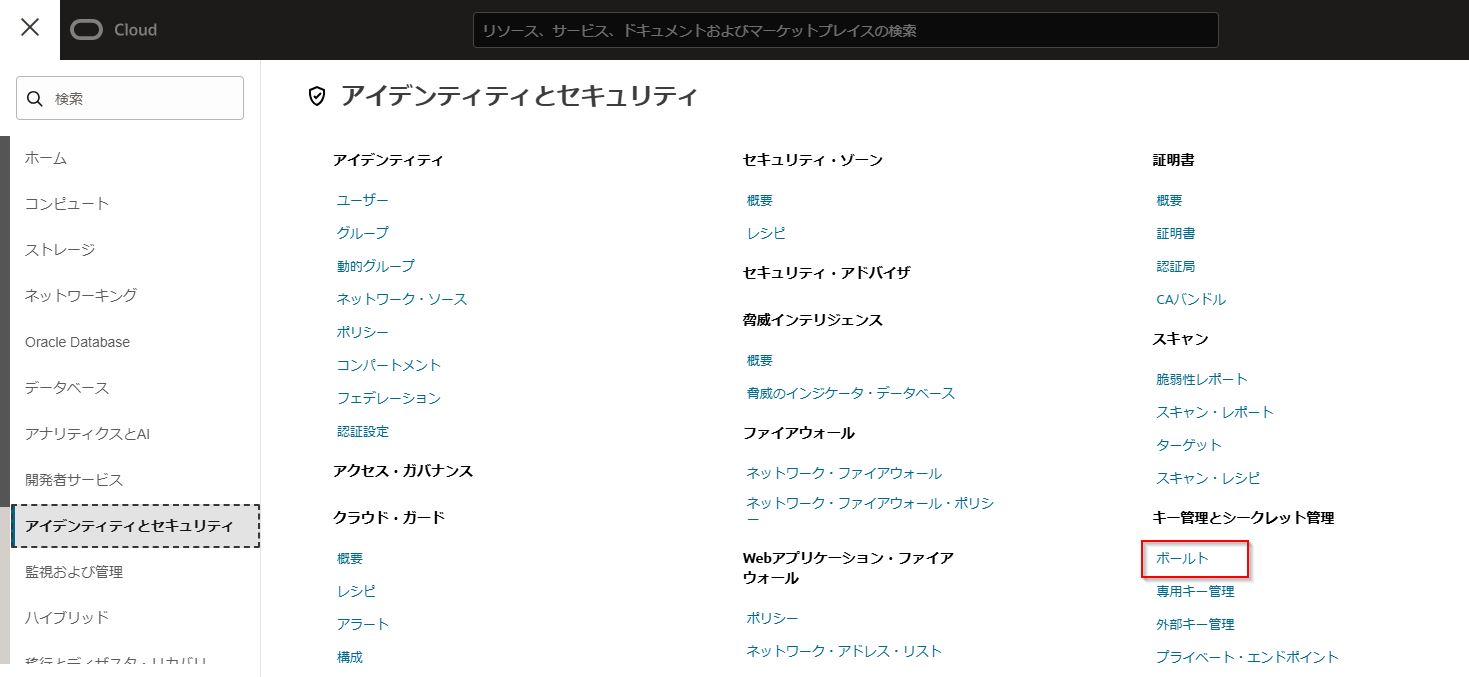 左上のハンバーガーメニューを展開して、「アイデンティティとセキュリティ」から「ボールト」を選択します。