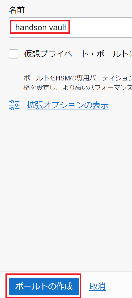 名前に「handson vault」と入力し、「ボールトの作成」をクリックします。