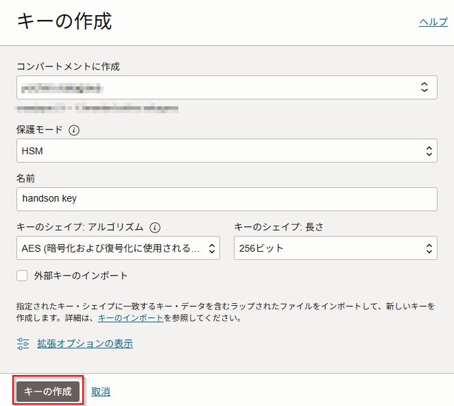名前に「handson key」と入力し、「キーの作成」をクリックします。