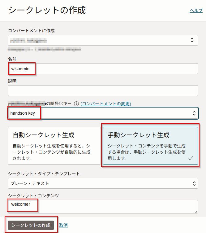 名前に「wlsadmin」と入力し、暗号化キーは「handson key」を選択し、シークレットコンテンツは「welcome1」と入力し、「シークレットの作成」をクリックします。