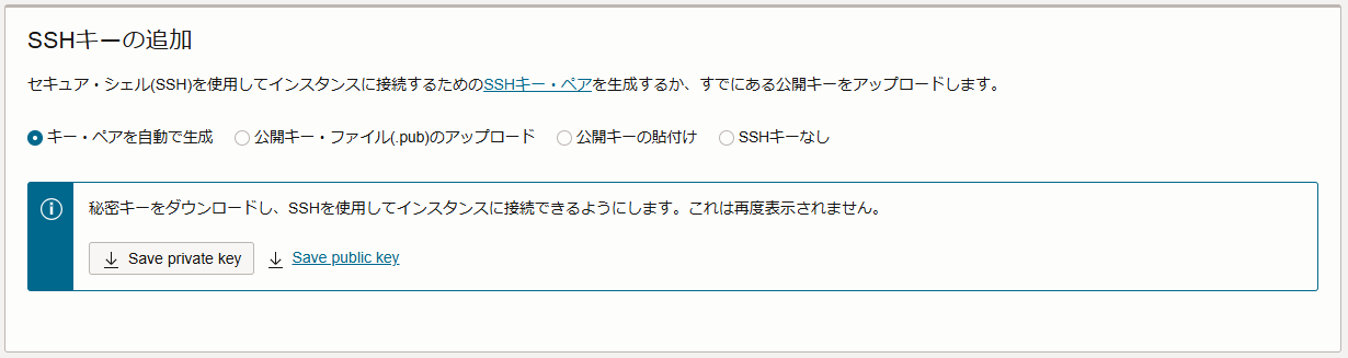 作成画面より、SSHキーの「秘密キー」と「公開キー」の両方をダウンロードし、利用します。