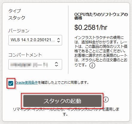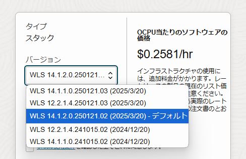 項目 値 Validated Secret for WebLogic Server Admin Password 2. OCI VaultでSecretを作成するで作成したSecretを選択 Java Development Kit version jdk21 -