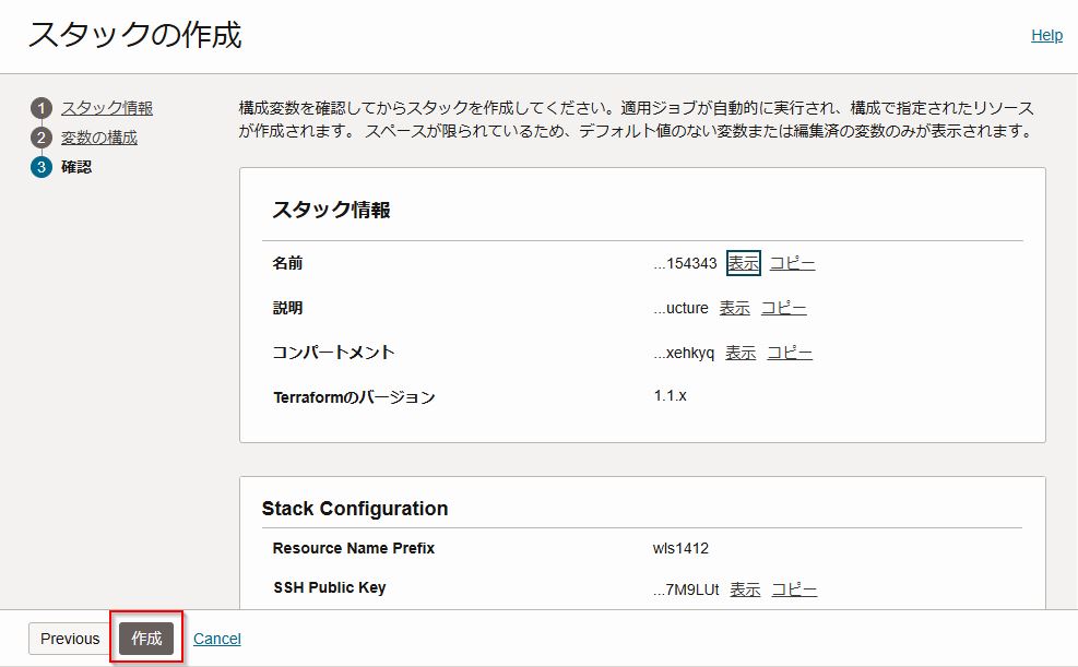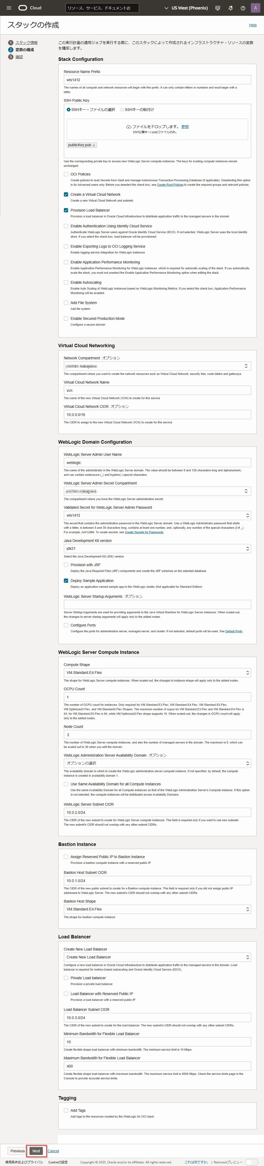 項目 値 Resource Name Prefix wls1412 SSH Public Key 1. SSHキーペアを用意するで作成したSSH Keyを選択。 OCI Policies ご利用の環境によって選択してください。 Create a Virtual Cloud Network チェックする Provision Load Balancer チェックする Enable Secured Production Mode チェックを外す -