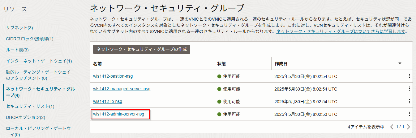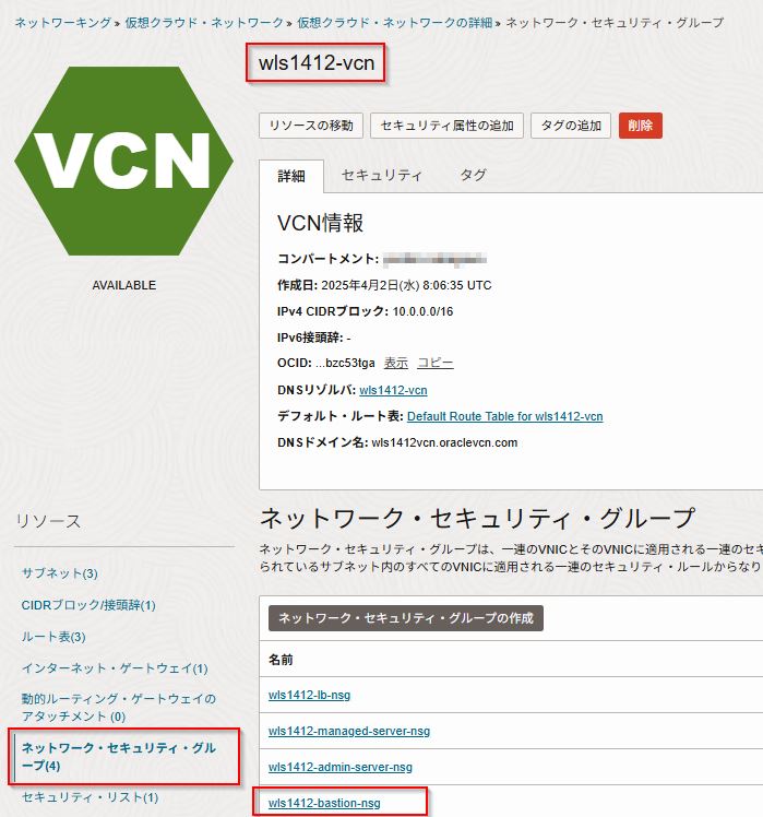 OCIにログインし、「ネットワーキング」ー「仮想クラウド・ネットワーク」から2. WebLogic Server for OCIをプロビジョニングするで作成されたVCN(本手順の場合はwls1412-vcn)を開いて、左下のメニューから「ネットワーク・セキュリティ・グループ」をクリックして、踏み台のセキュリティ・グループである wls1412-bastion-nsg をクリックして開きます。