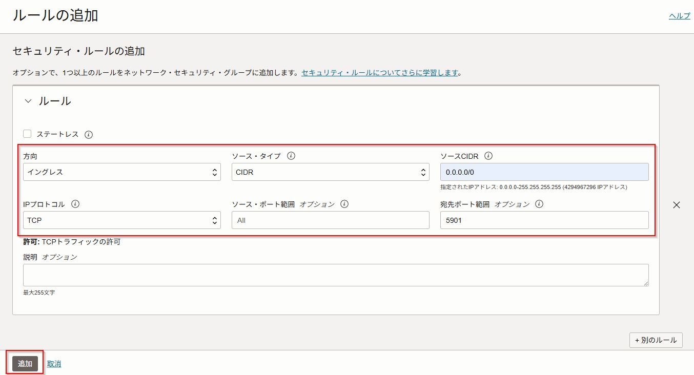 「ルールの追加」をクリックして、5901ポートをイングレスに追加します。
