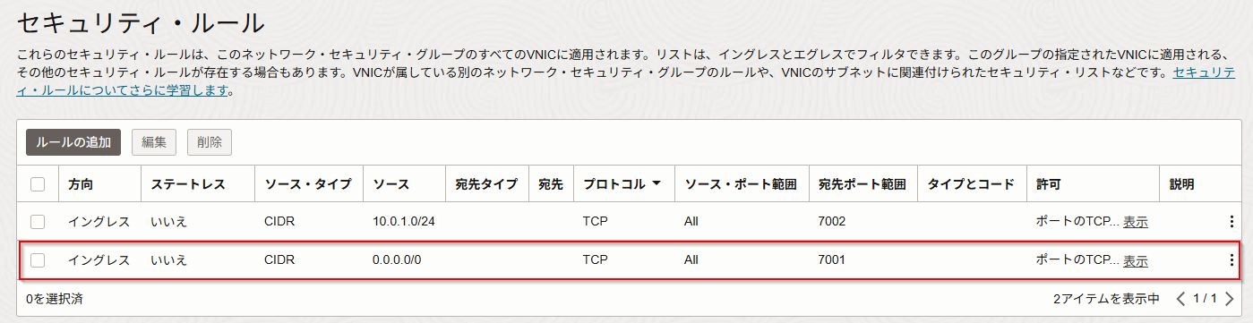 次に同様の手順で、管理サーバーのネットワーク・セキュリティ・グループ(wls1412-admin-server-nsg)の7001ポートをイングレスに追加します。