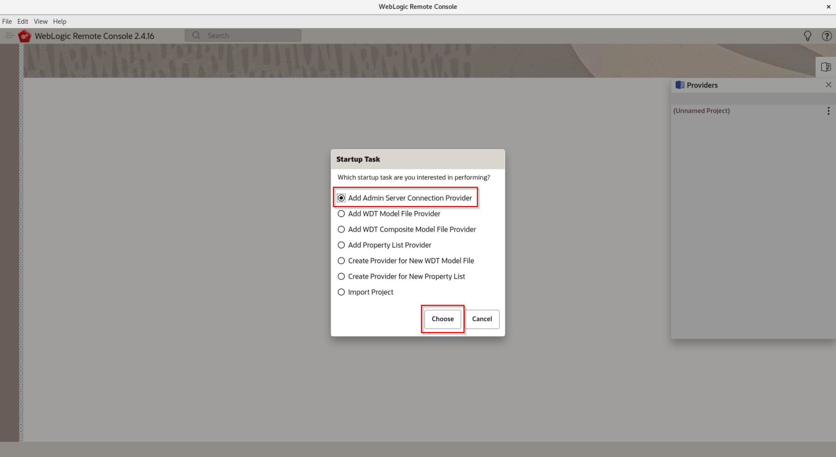 Startup Taskでは Add Admin Server Connection Provider を選択して「Choose」をクリックします。