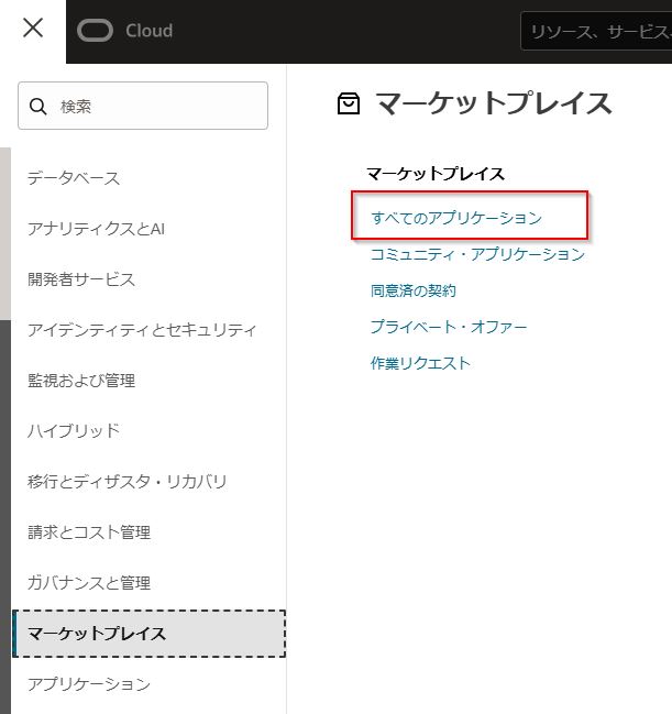左上のハンバーガーメニューを展開して、「マーケットプレイス」から「すべてのアプリケーション」を選択します。