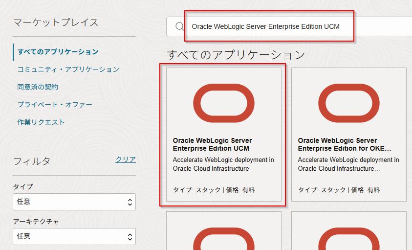 検索欄に「Oracle WebLogic Server Enterprise Edition UCM」と入力し、先頭に出てくるパネルをクリックします。