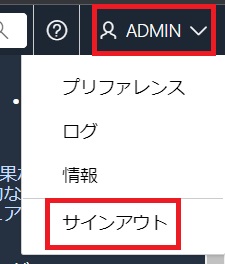 画面右上、「ADMIN」をクリックし、「サインアウト」をクリック