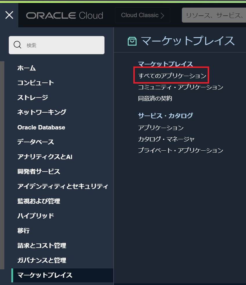 左上のハンバーガーメニューを展開して、「マーケットプレイス」から「すべてのアプリケーション」を選択します。