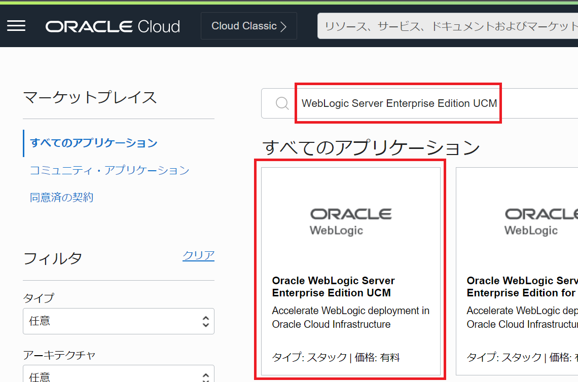 検索欄に「WebLogic Server Enterprise Edition UCM」と入力し、先頭に出てくるパネルをクリックします。