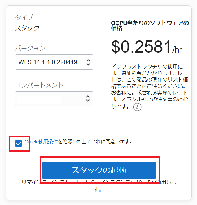 チェックボックスにチェックを入れ、「スタックの起動」をクリックします。
