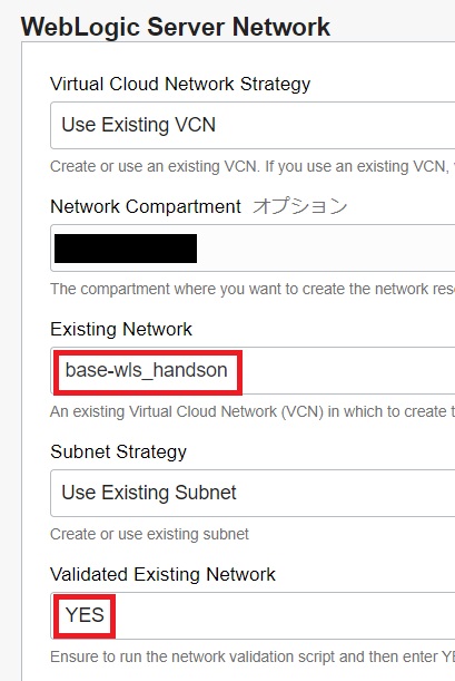 Existing Networkは「base-wls_handson」を選択し、Validated Existing Networkに「YES」と入力します。