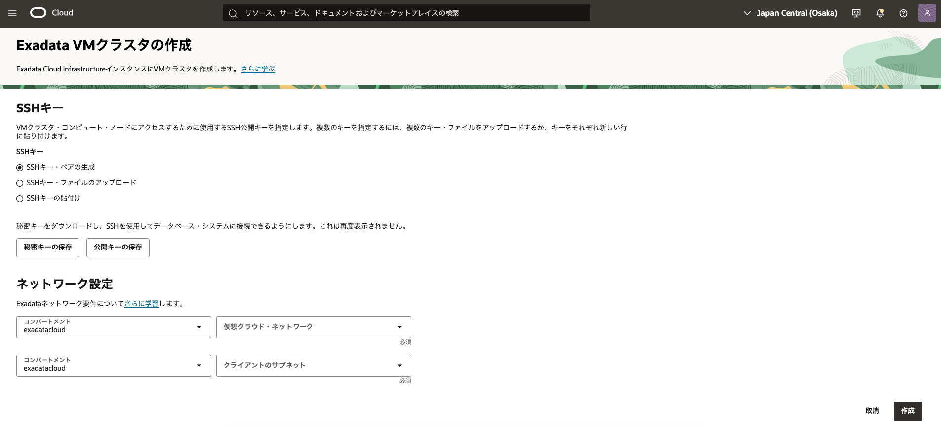 - SSH 鍵 - 2. Exadata VM クラスタの作成の 3.で追加した公開鍵と対になる秘密鍵を使用します。
