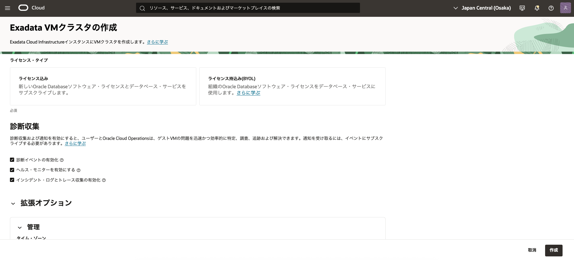 Exadata VM クラスタの作成 の各項目は以下のように設定します。その他の設定はデフォルトのままにします。