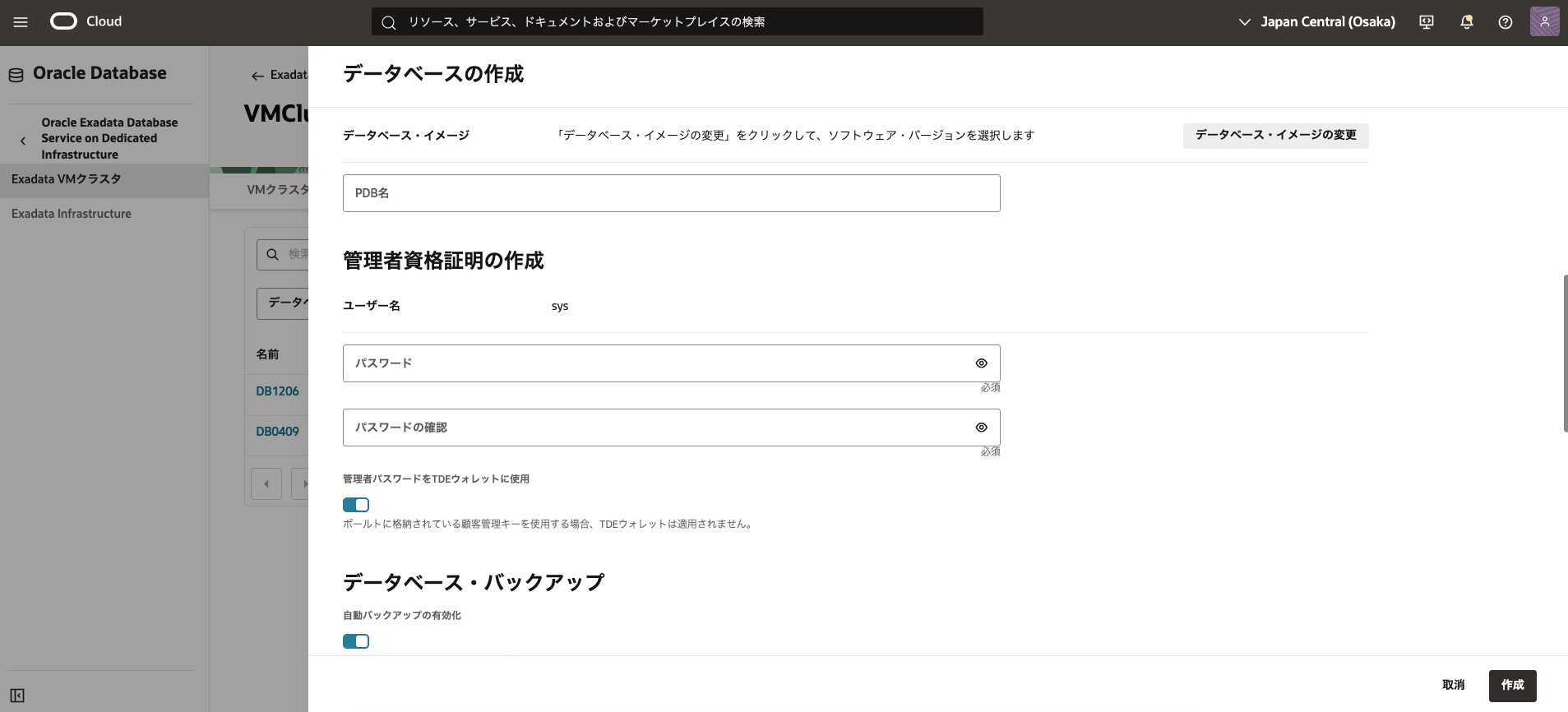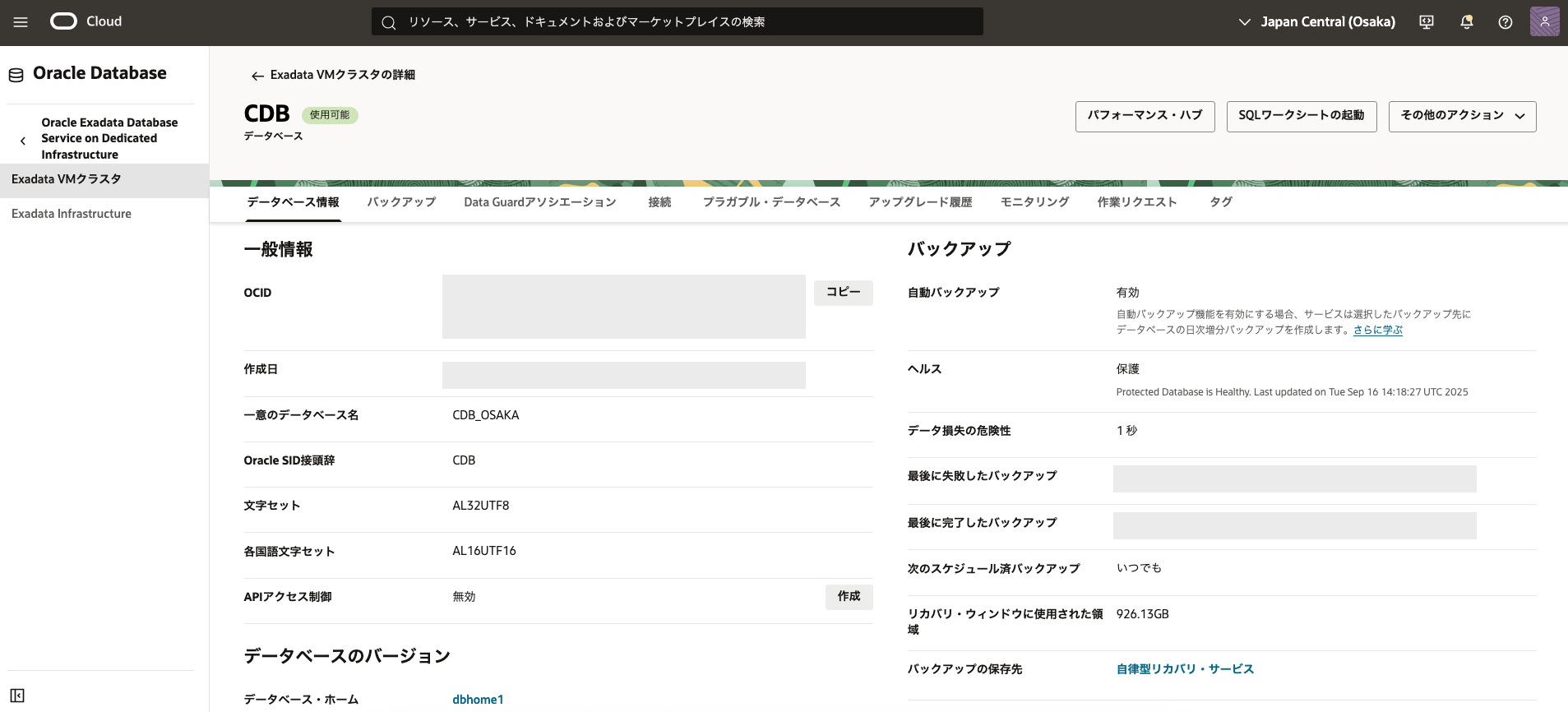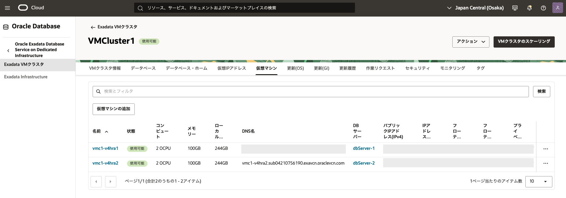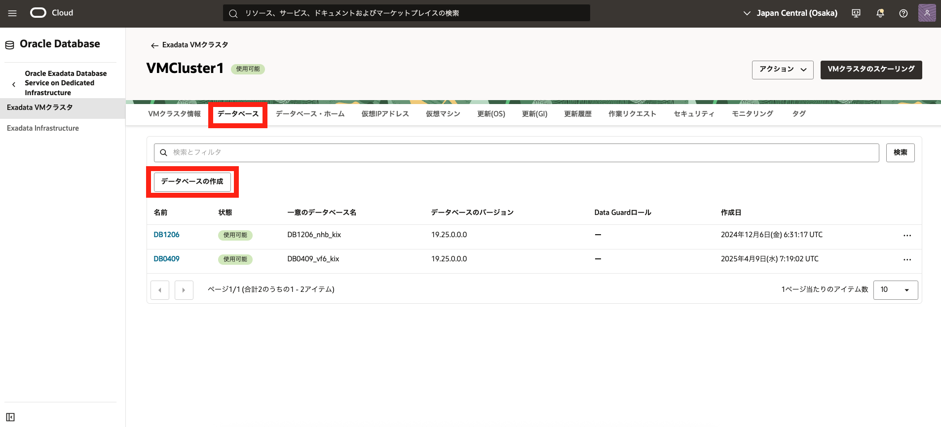 - 2. Exadata VM クラスタの作成で作成したExadata VM クラスタの表示名をクリックします。 データベースの一覧から3. データベースの作成で作成したデータベースの名前をクリックします。