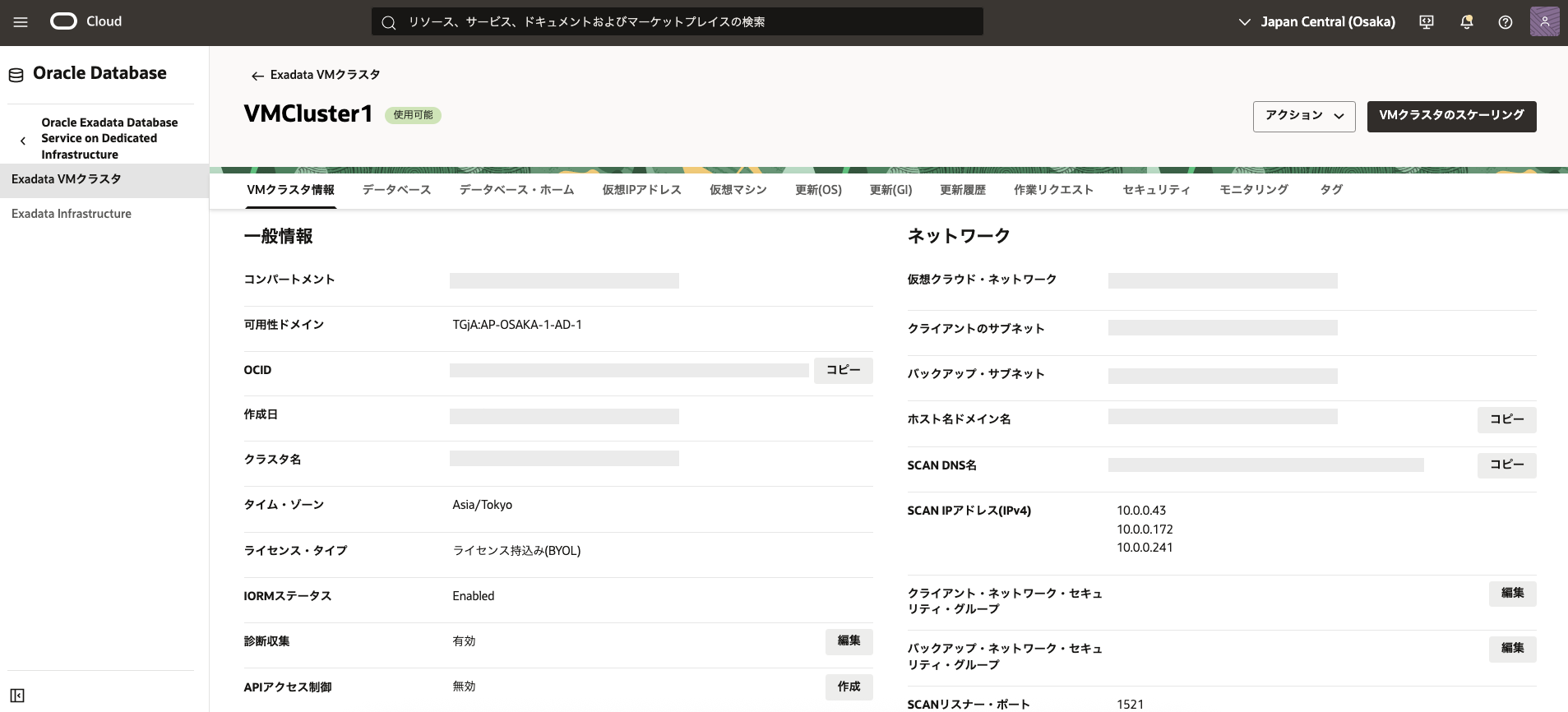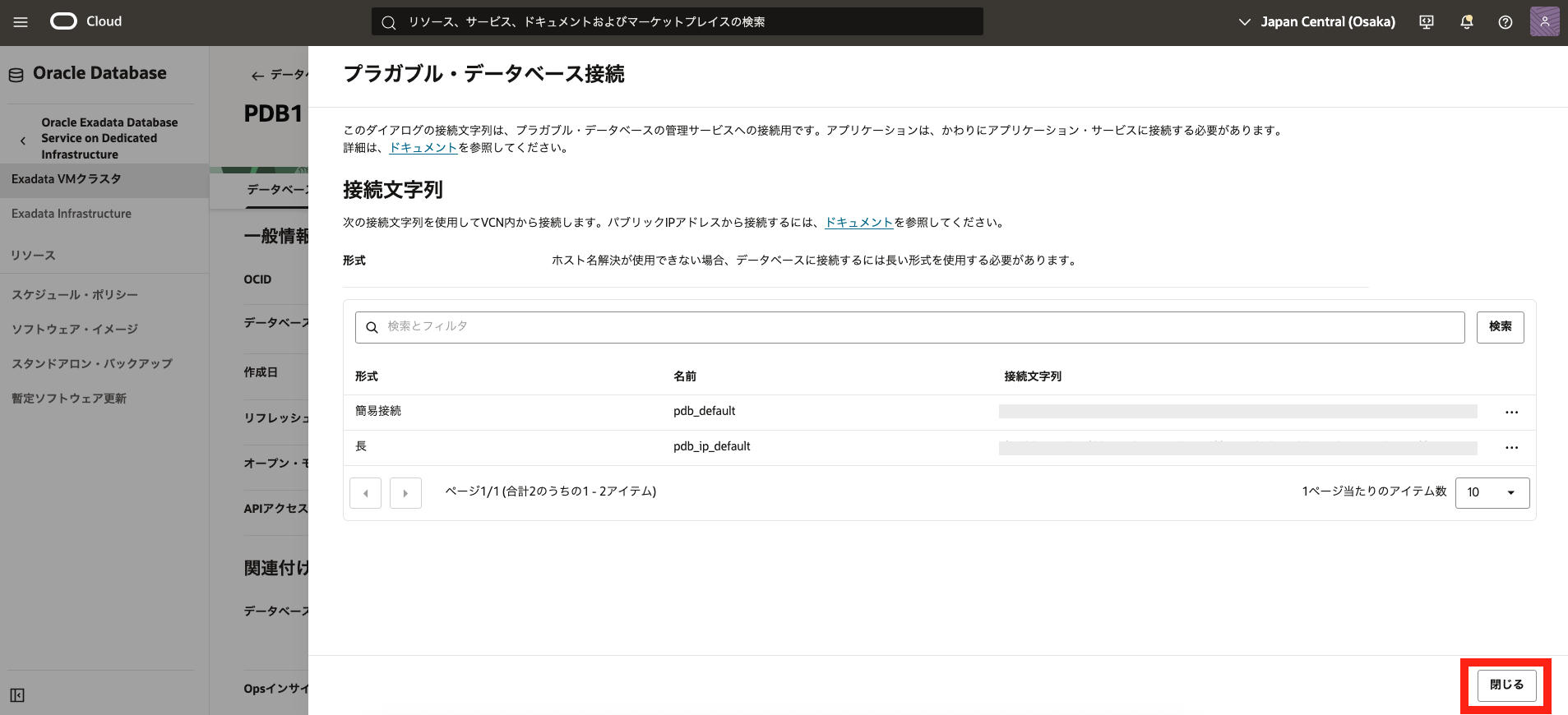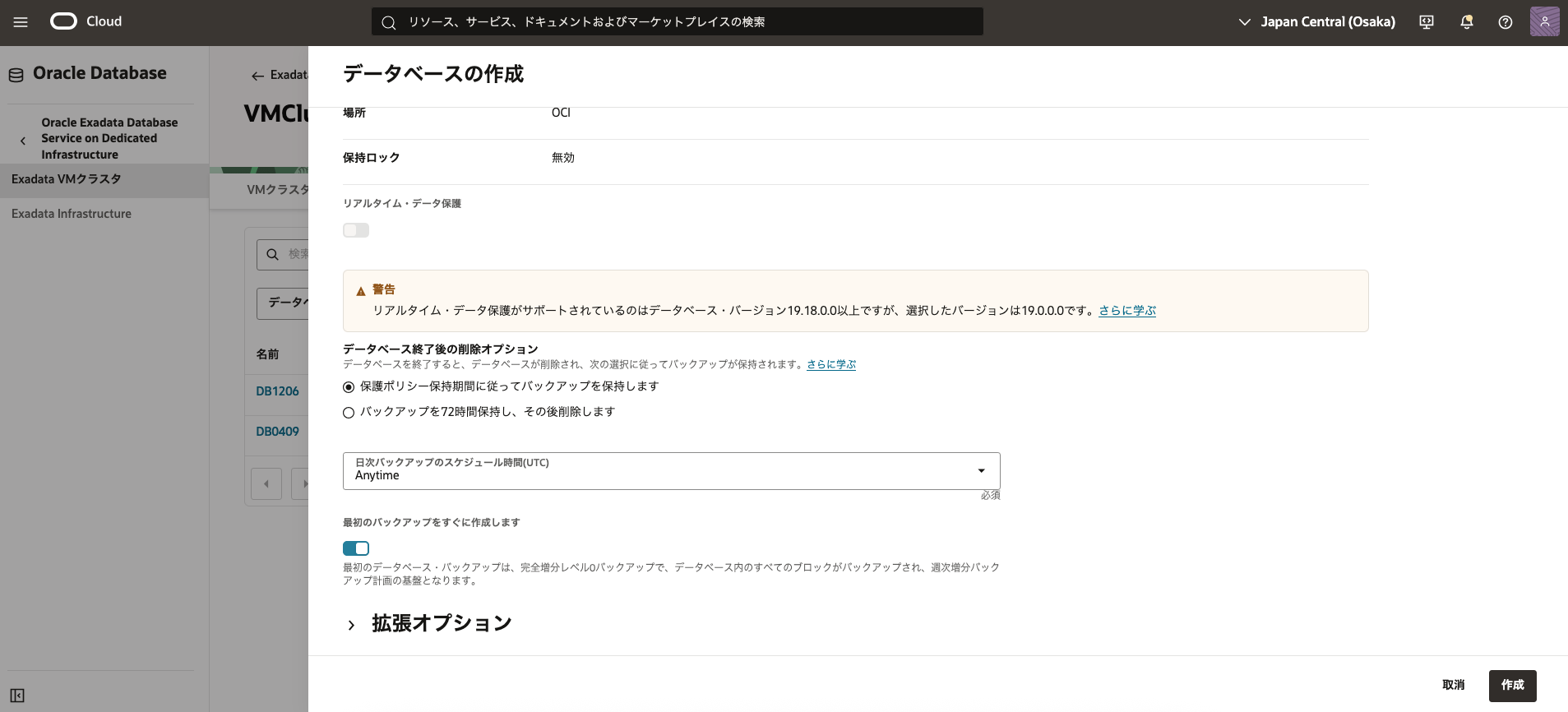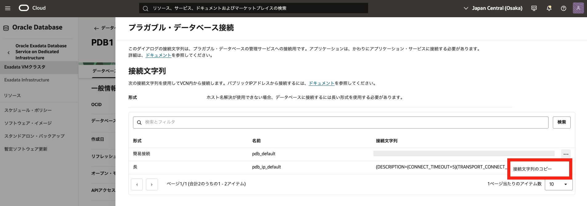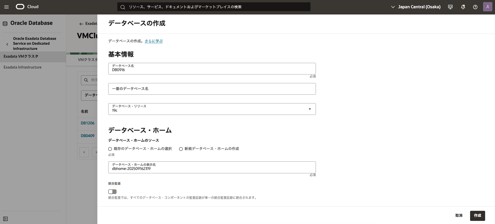 - 2. Exadata VM クラスタの作成で作成したExadata VM クラスタの表示名をクリックします。 データベースの一覧から3. データベースの作成で作成したデータベースの名前をクリックします。