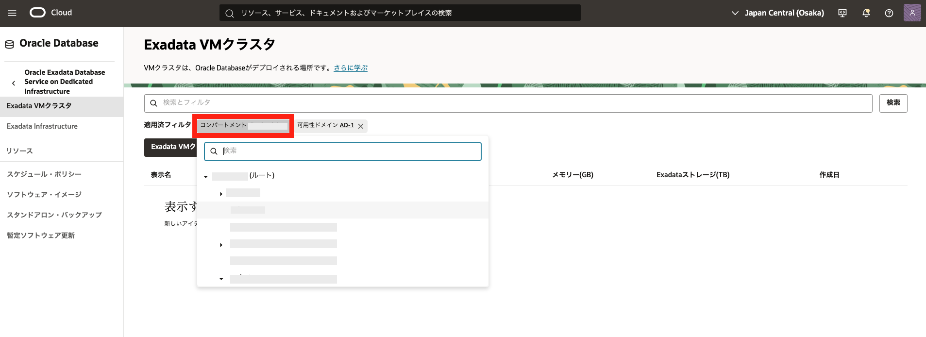 - [コンパートメント名]の Exadata インフラストラクチャの選択 - 1. Exadata Infrastructure の作成で作成した Exadata インフラストラクチャを選択します。