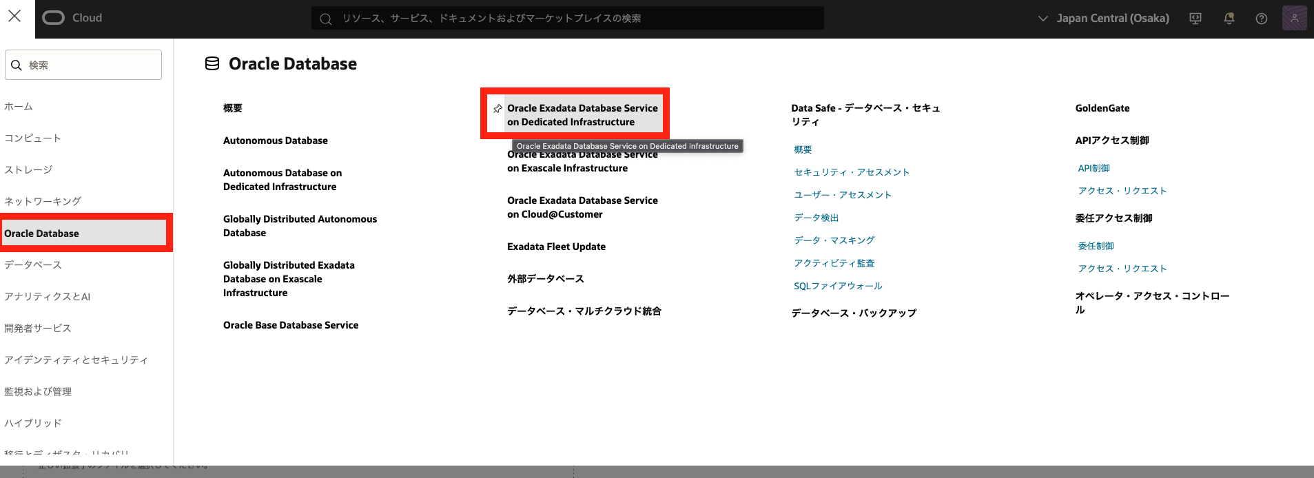 - OCI コンソール・メニューから Oracle AI Database → Oracle Exadata Database Service on Dedicated Inrastructure に移動します。