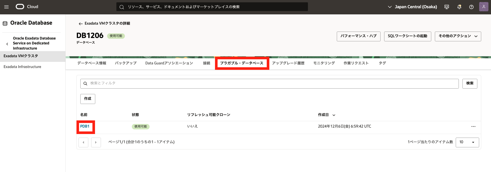 - リソースの一覧からプラガブル・データベースをクリックします。 プラガブル・データベースの一覧から接続したい PDB の名前をクリックします。