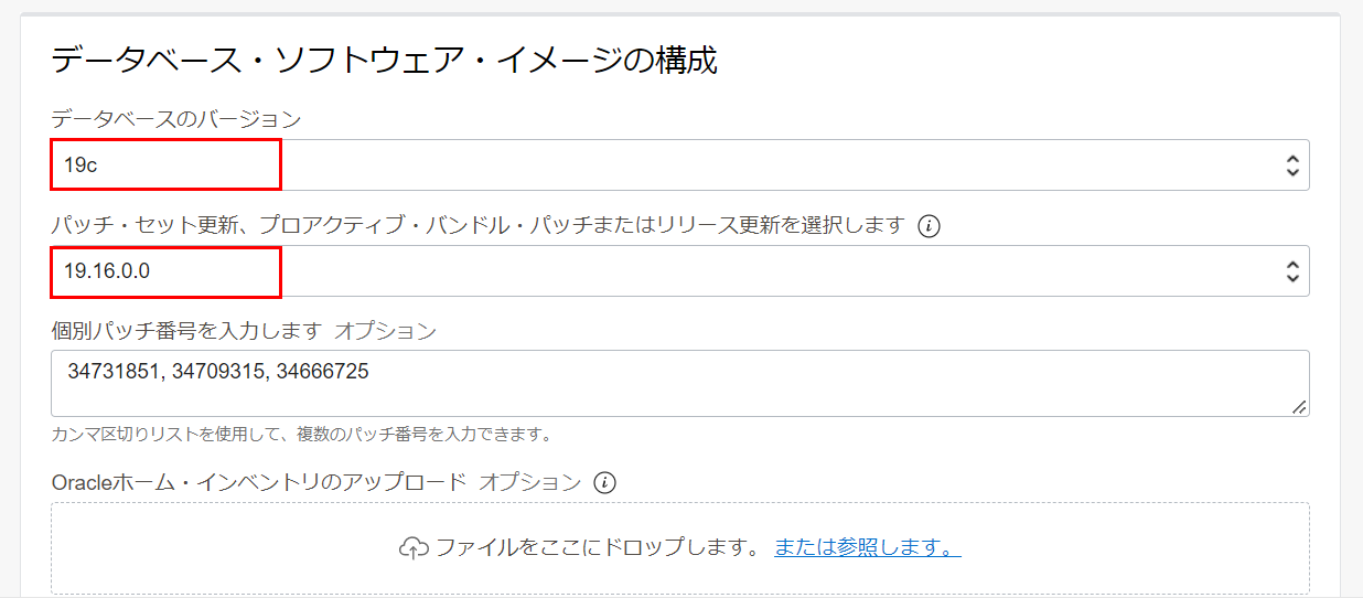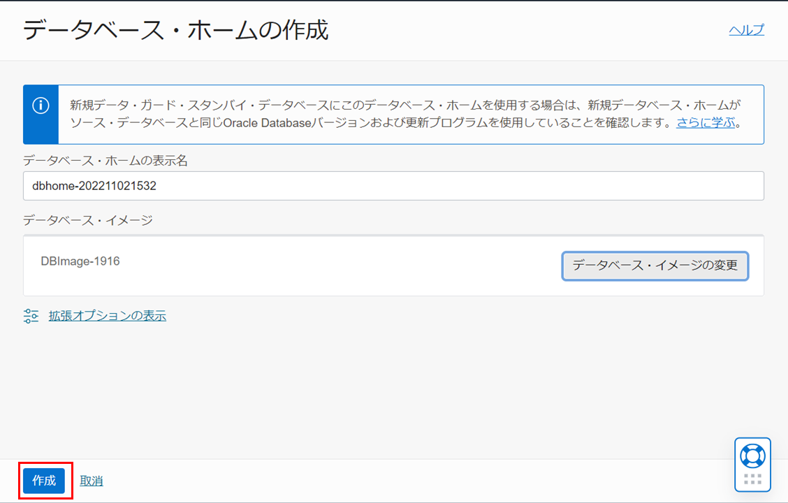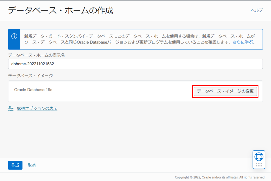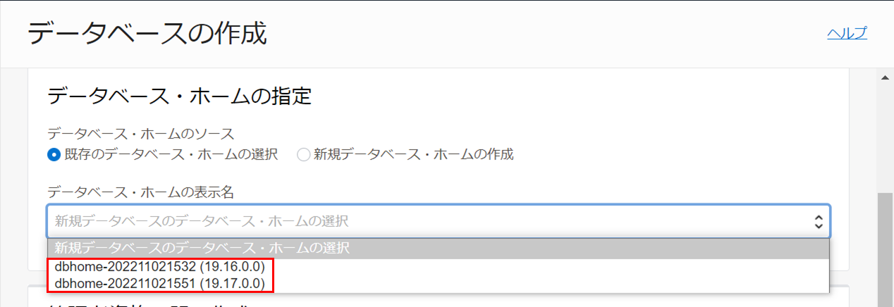 1. データベース・ホームの作成と2. カスタム・イメージを使用したデータベース・ホームの作成で作成したデータベース・ホームがデータベースの作成の設定画面で選択できるようになっていることを確認します。