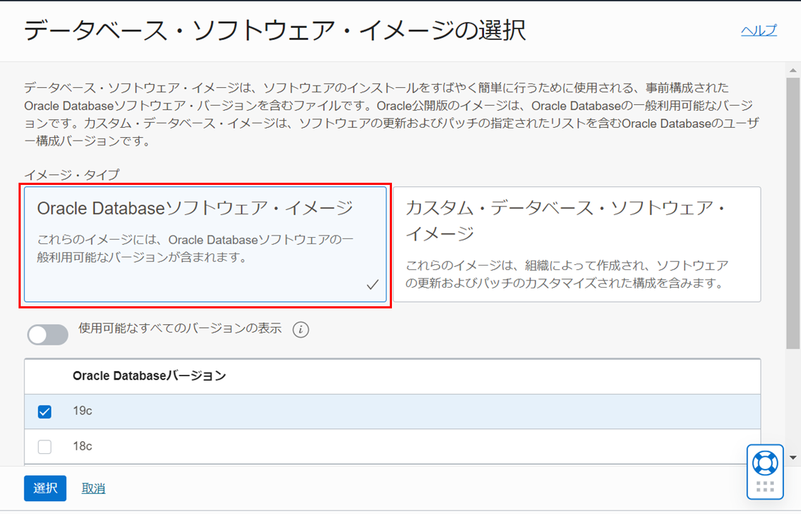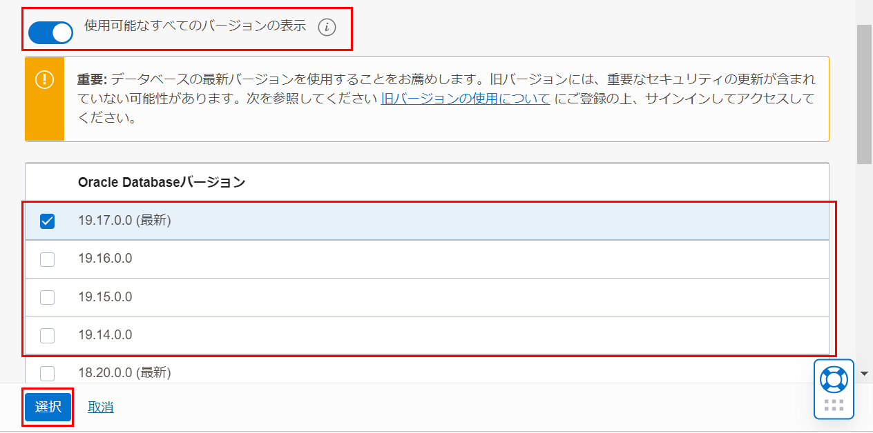 使用可能なすべてのバージョンの表示の横のボタンをクリックすると、Oracle AI Database のバージョンとして、最新と直近 3 つ前(N-3)までのバージョンから選択できます。作成したいバージョンを選択して、選択をクリックします。(本ガイドでは、19.17.0.0 を選択します。)