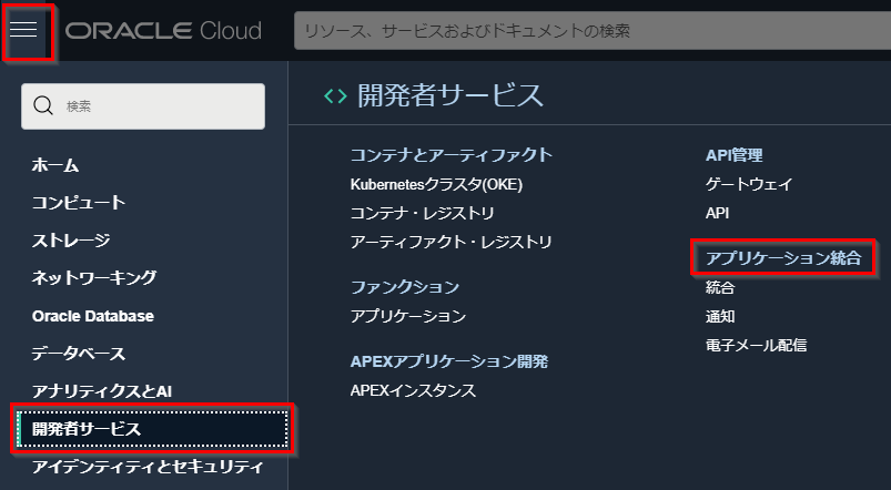 OCI コンソールの画面左上にあるハンバーガー・メニューをクリックし、 「開発者サービス」 カテゴリにある 「アプリケーション統合」 をクリックします。