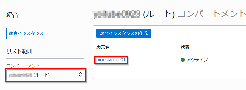 OCI コンソールの画面左側のリストから、Oracle Integration Cloud のインスタンスを作成したコンパートメントを選択し、ファイル・サーバーを有効化するOracle Integration Cloudのインスタンスをクリックします。
