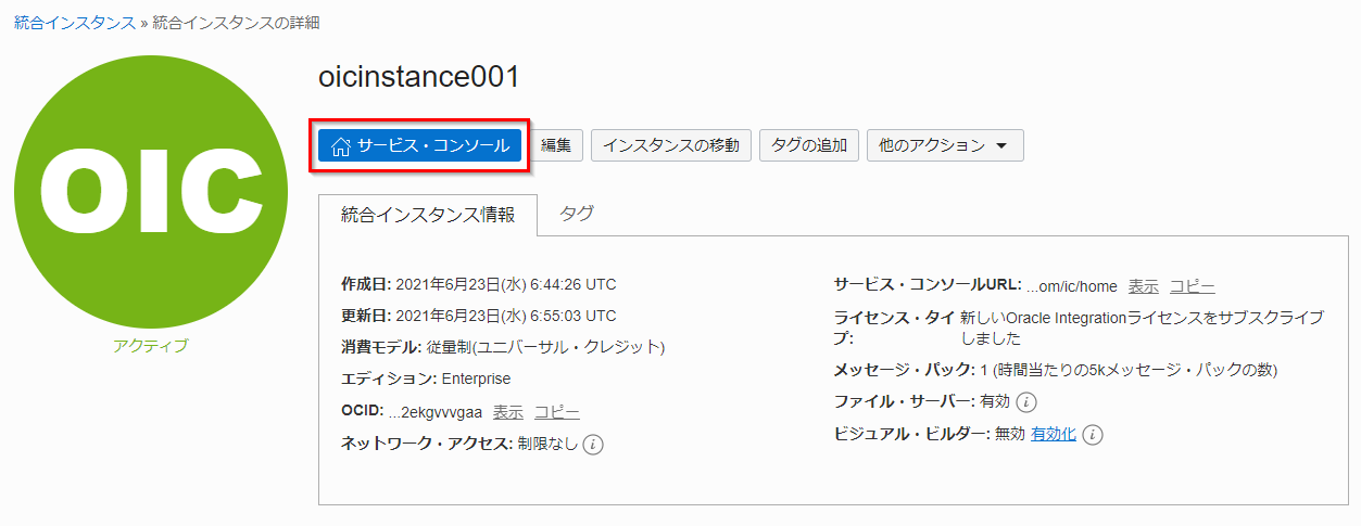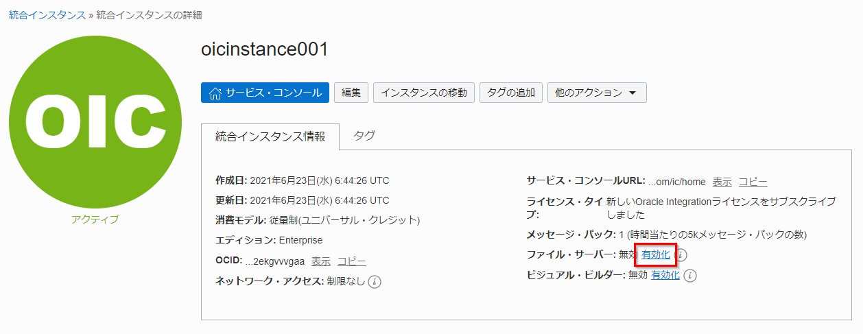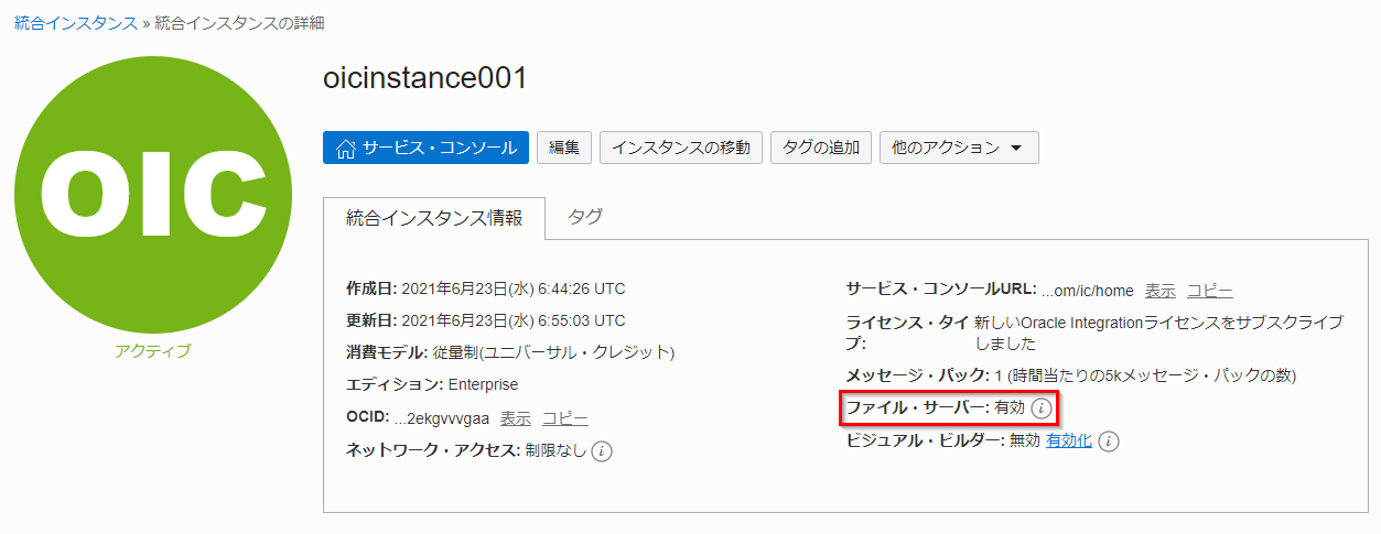 ファイル・サーバーの有効化処理が終了すると、「統合インスタンス情報」 の 「ファイル・サーバー」 が 「有効」 と表示されます。 また、Oracle Integration Cloud のインスタンスのステータスは 「アクティブ」 に変更されます。