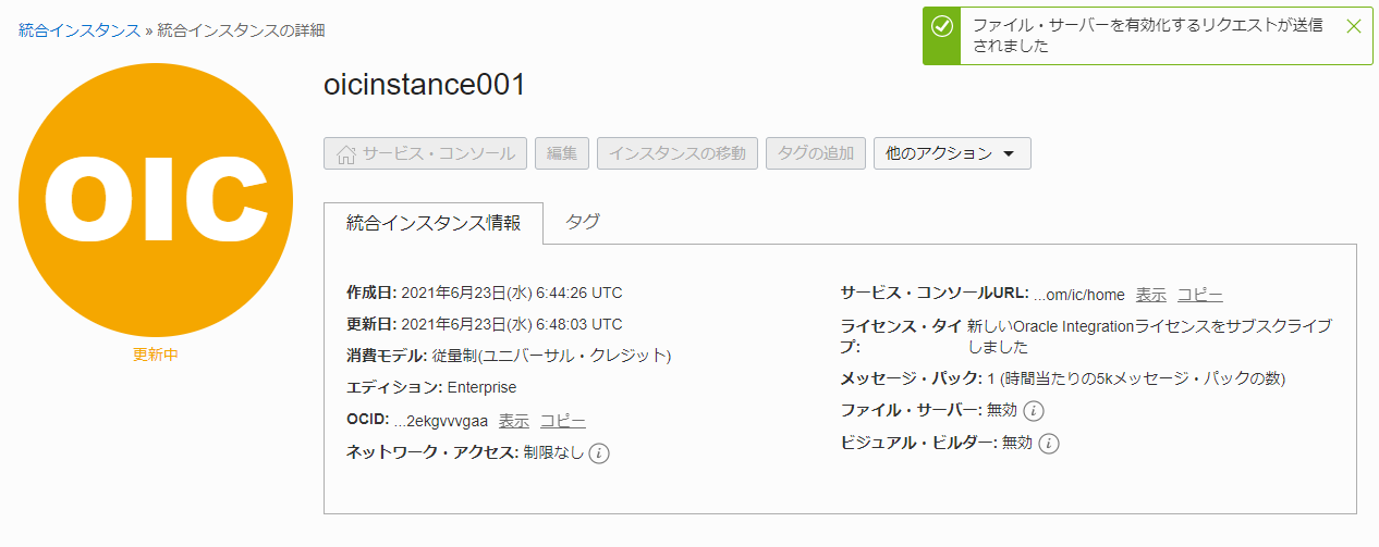 ファイル・サーバーを有効化する処理が開始されたことを表すメッセージが表示されます。 また、Oracle Integration Cloud のインスタンスのステータスが 「更新中」 に変更されます。