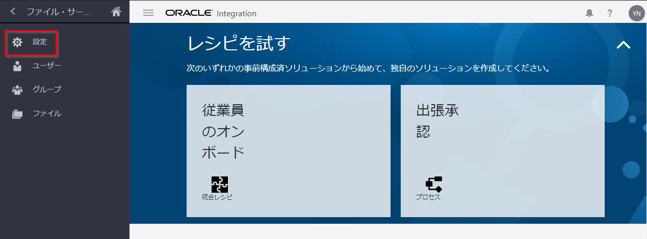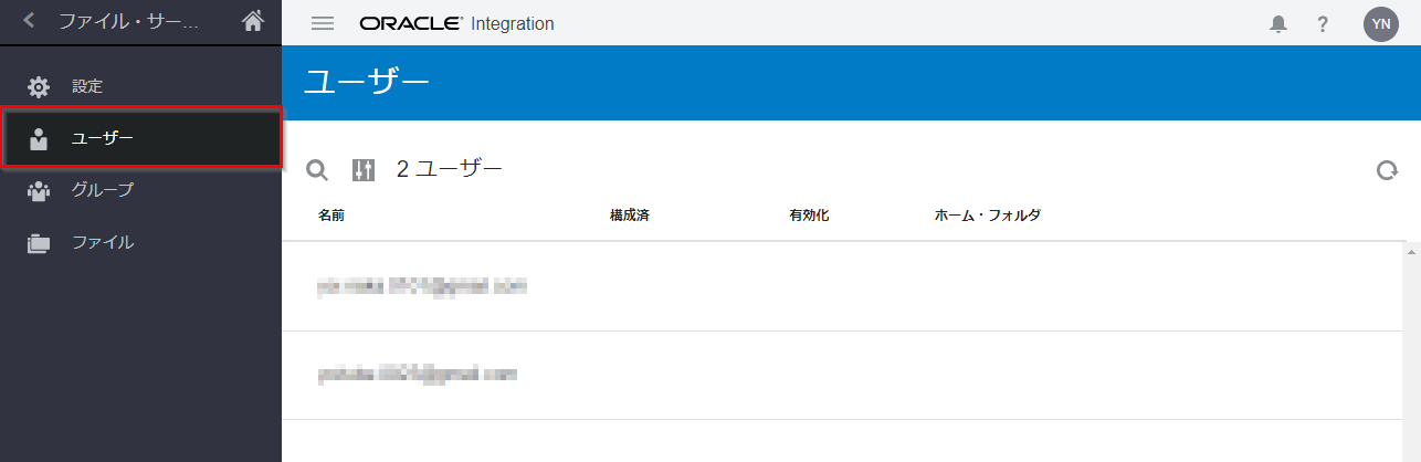 Oracle Integration Cloud のサービス・コンソールにログインします。 すでにファイル・サーバーの 「設定」 ページを開いている場合は、ナビゲーション・ペインで 「ユーザー」 をクリックします。「ホーム」 から遷移する場合は、ナビゲーション・ペインで 「設定」 → 「ファイル・サーバー」 → 「ユーザー」 をクリックしてください。